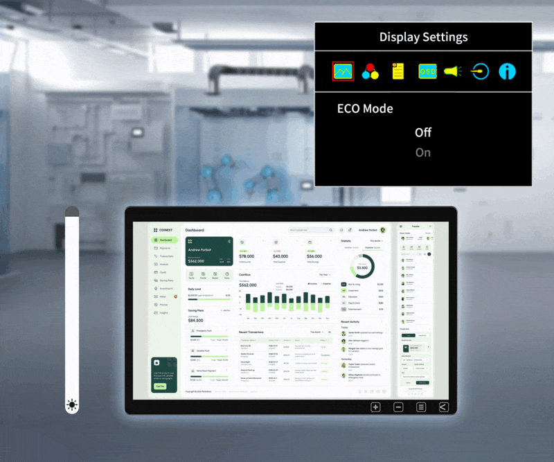 The high brightness 450nits panel ensures visibility in bright environments. In typically bright indoor spaces, activating “Eco Mode” sets the brightness to “60” and gradually increase it over time, which helps extend the backlight lifespan by 20%–30%!greatly extended.