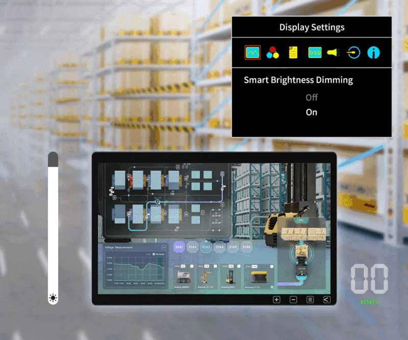 TUsing exclusive patented technology, once the ‘Smart Brightness Dimming’ function is activated, the screen automatically dims after 30 minutes of no touch activity. Tapping on the touchscreen lightly restores the brightness, effectively reducing idle power consumption and enhancing panel's life!