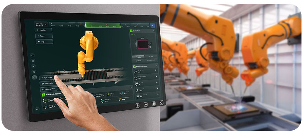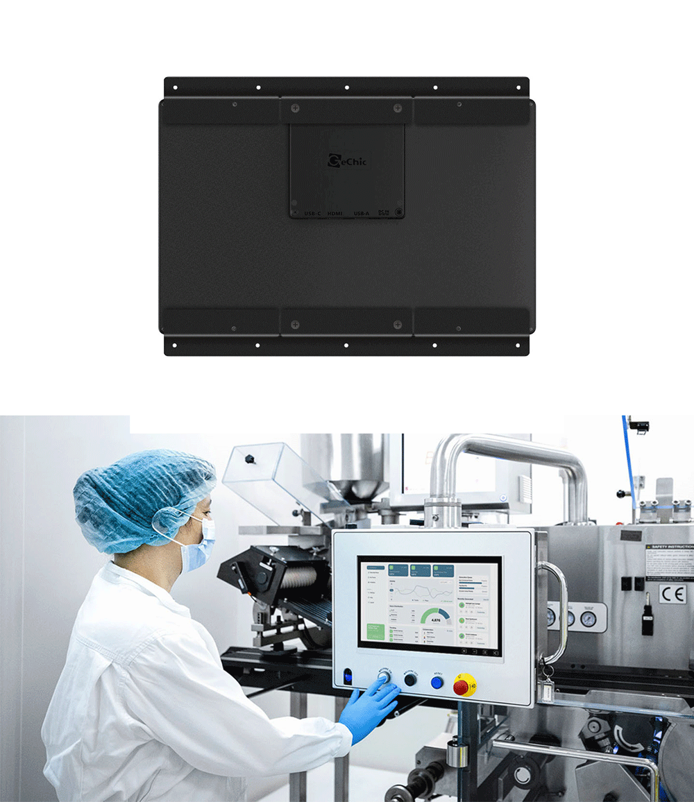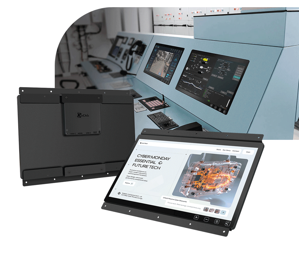 The monitor features a solid structure with 7H high-hardness glass for scratch resistance, dirt resistance, and easy cleaning. The lightweight aluminum alloy backplane adds strength while keeping the profile slim at just 11mm, integrating ports and VESA mounting holes in the rear I/O block. Combining a sleek, high-tech look with industrial-grade durability, it’s ideal for production lines, machine rooms, and commercial spaces.