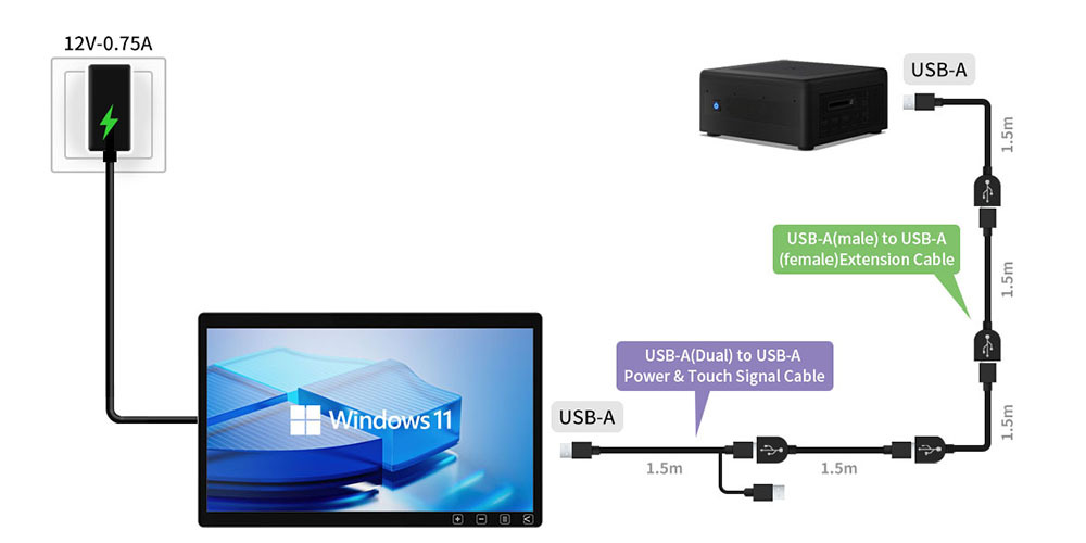 *When extending USB cable, please use the 12V adapter to power the monitor.
