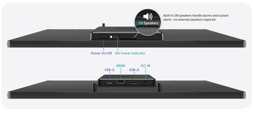 All connection ports are integrated beneath the rear I/O base for streamlined cabling! Alongside a standard HDMI-A input compatible with laptops, desktops, industrial PCs, and single-board computers, the T315 also features a USB Type-C (DisplayPort Alternate Mode) port supporting Thunderbolt 3/4 video signal input, which simultaneously transmits audio-visual content, power, and touch signals