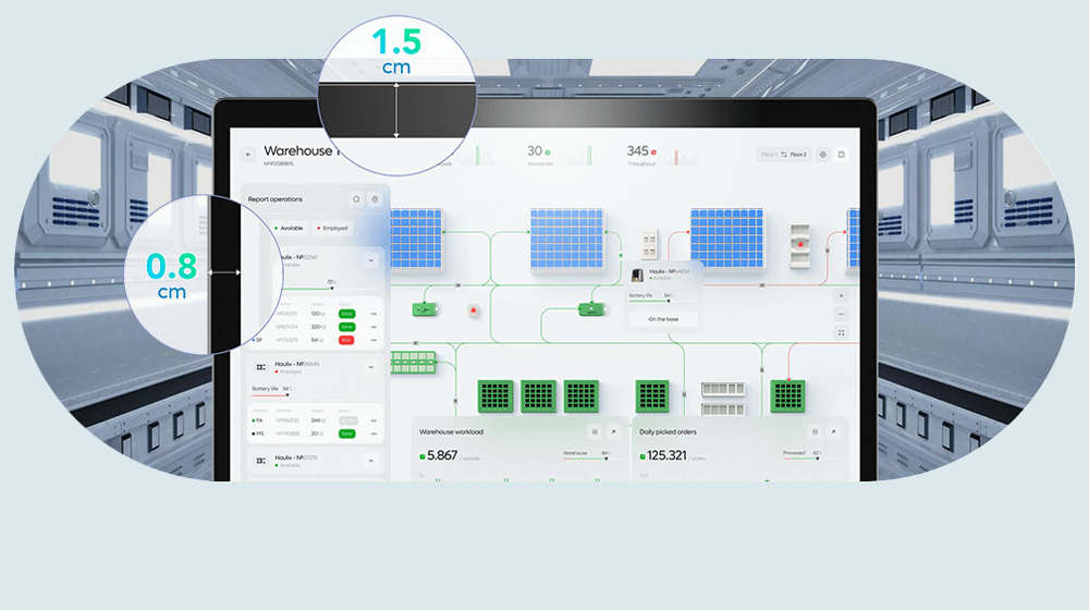 The Full HD 15.6-inch panel has ultra-high contrast rate, rendering sharp, easily legible text and images. With extreme brightness, T315 is ideal for well-lit production lines, warehouses, and for integration into POS terminals and kiosks in commercial environments. With its narrow 0.8–1.5 cm bezel, the compact T315 maximizes the display area, allowing the monitor to be seamlessly embedded into equipment for a sleek and streamlined design.